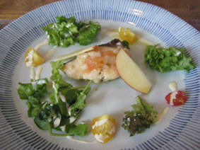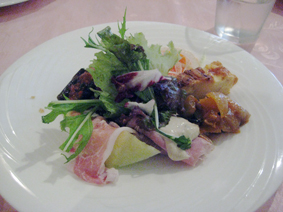 キッシュやラタトゥユっぽいのや、サーモンのマリネ、生ハムとメロンなどこの一皿でワイン〜って位。