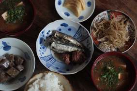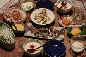 秋刀魚のみりん干し、茶碗蒸し(たっぷり!)、人参の味噌漬け、おぼろ豆腐、ぬか漬け、独活のサラダ、信たまねぎのサラダ。独活のてんぷら。