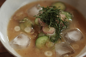 朴葉味噌をこしらえて、サッと焼いた宮崎牛とこんがりとした葱、オクラにつけて食べます。