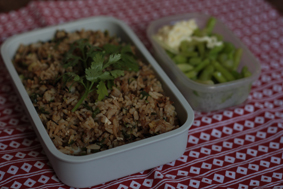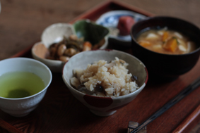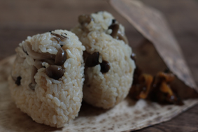 舞茸と椎茸の炊き込みおにぎり、白菜の浅漬け、イワシのつみれ揚げ、サツマイモのきんぴら風。