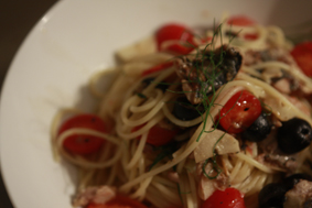 さんまをガーリックとオリーブ、トマトとパスタにしてみた。